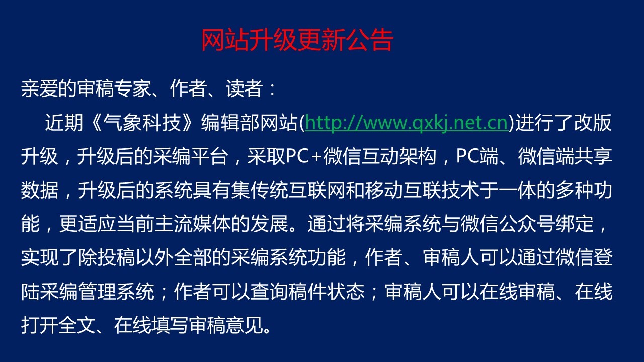 《氣象科技》創(chuàng)刊于1973年,由中國(guó)氣象局氣象探測(cè)中心、中國(guó)氣象科學(xué)研究院、北京市氣象局、國(guó)家衛(wèi)星氣象中心及國(guó)家氣象信息中心聯(lián)合主辦,是一份具有工程技術(shù)特色的氣象綜合技術(shù)期刊,刊載大氣科學(xué)各領(lǐng)域發(fā)展水平的綜合評(píng)述及反映大氣科學(xué)及相關(guān)科學(xué)各領(lǐng)域新理論、新方法和新技術(shù)的研究論文。主要欄目包括: 大氣探測(cè)與信息技術(shù),天氣氣候與數(shù)值預(yù)報(bào),應(yīng)用氣象與科學(xué)實(shí)驗(yàn),臺(tái)站實(shí)用技術(shù)等。歡迎從事大氣科學(xué)及相關(guān)學(xué)科研究的科研、業(yè)務(wù)、教學(xué)人員投稿和訂閱。